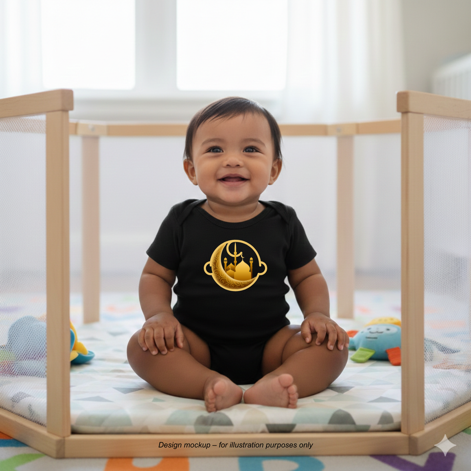 A soft, lightweight infant bodysuit that brings a little wonder to everyday wear. Crafted from combed ringspun cotton with gentle ribbed binding and side seams for shape retention, it feels smooth against delicate skin and moves easily with every wiggle. The front features a small, whimsical baby-face emblem framing a dreamy skyline in cool blues—subtle, modern, and playful. Snaps at the crotch make quick changes simple, and the tear-away label keeps irritation away. REACH-certified and made with care, this bodysuit works well for sleepy mornings at home, stroller strolls through the neighborhood, or quiet family gatherings where comfort matters most.